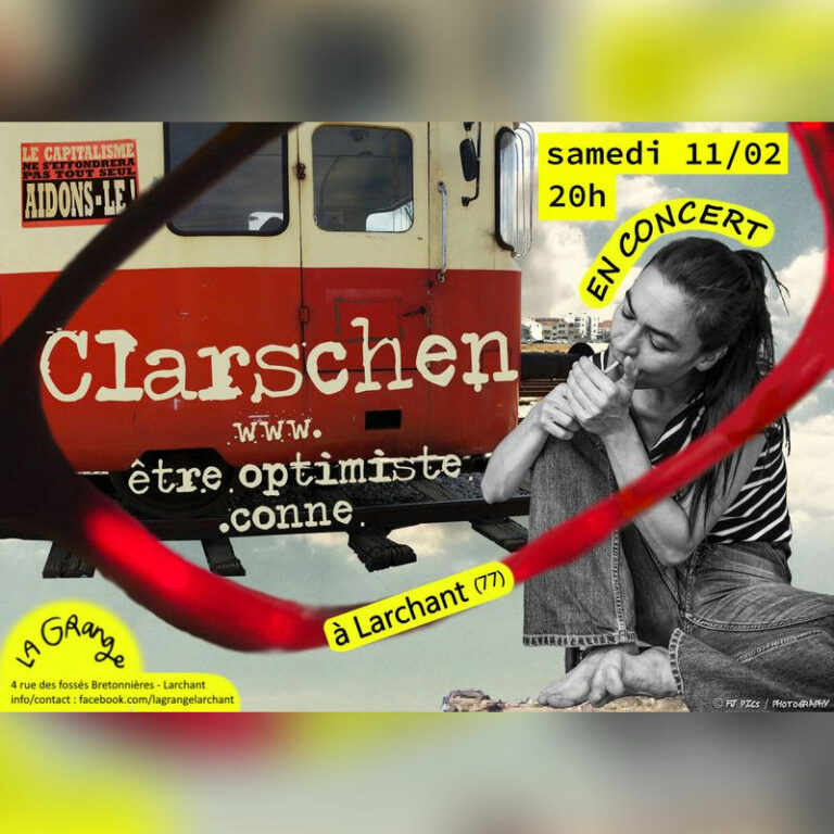 Ne manquez pas le concert de Clarschen, une talentueuse musicienne solo multi-facetée, trompettiste et actrice engagée politiquement. Le concert aura lieu dans la salle de La Grange à Larchant et promet d’être une soirée musicale unique. Avec sa trompette puissante et sa voix captivante, Clarschen transportera le public dans un univers musical personnel et engagé. Venez découvrir l’artiste en personne et partagez une soirée musicale.
