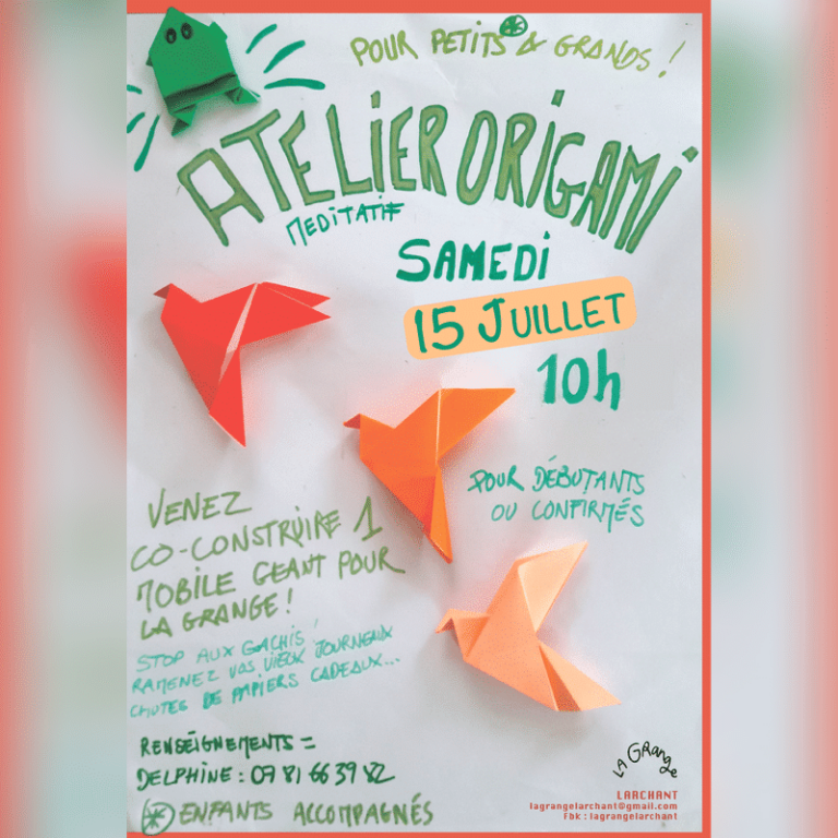 Venez avec vos papiers recyclés ou de jolis papiers à motif. Delphine vous aidera et vous donnera des idées pour l’origami. Cet atelier est fait pour tous·tes et il se déroulera jusqu’à midi.