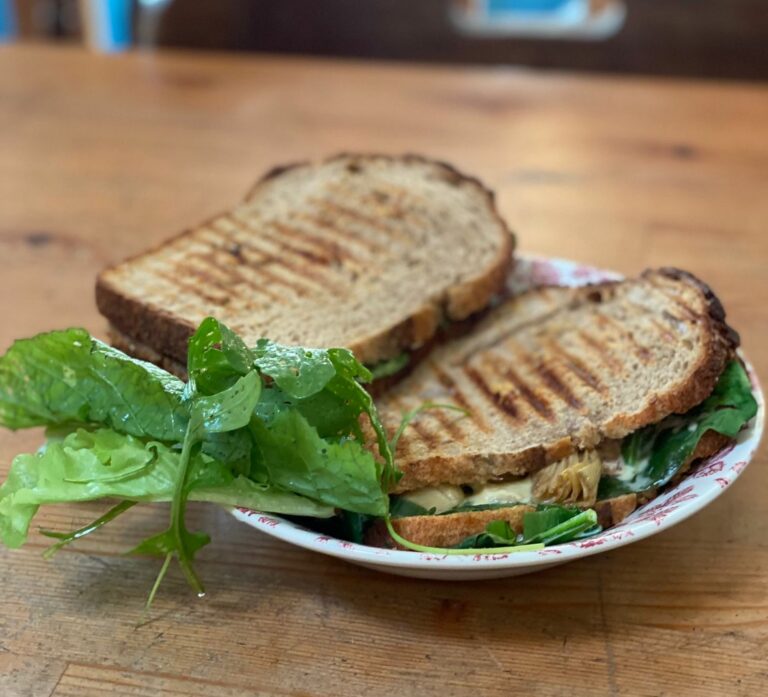 Deux tranches du pain cuit au four du village par le Miam, coincés là-dedans quelques fromages de notre crémerie (ou une alternative vegan), des petits légumes de saison du jardin, le tout cuit dans notre magnifique machine à panini et hop! On se régale!